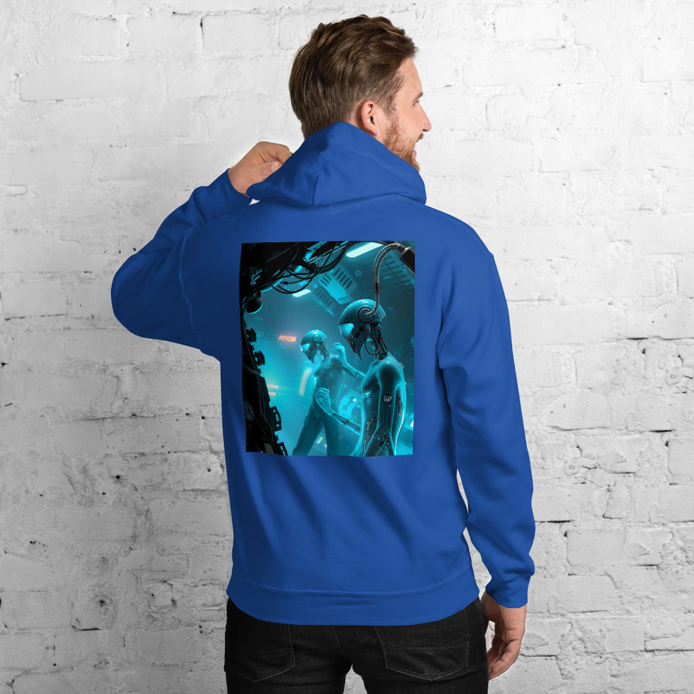 The Mystique Collection takes you deep into a neon-blue future where alien forms, cybernetic constructs, and advanced robotics merge into one surreal universe. Every design in this series captures a cold, atmospheric glow — the perfect mix of extraterrestrial elegance and high-tech dystopia. Detailed, moody, and cinematic, these pieces stand out instantly on the back of each hoodie.